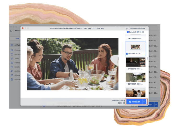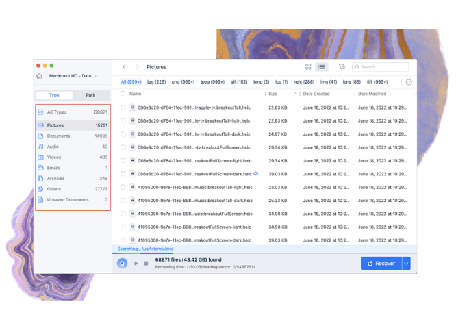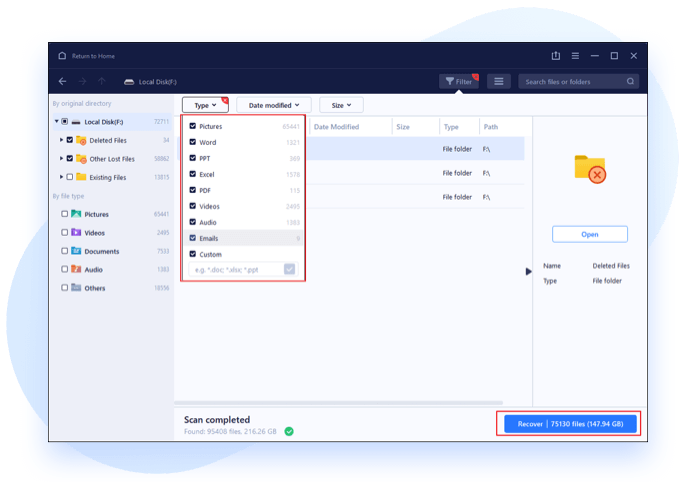 Recupere arquivos perdidos, sejam eles imagens, vídeos, músicas, documentos, e-mails ou arquivos compactados, enquanto obtém suporte para filtros, opções de visualização e modo de varredura profunda.