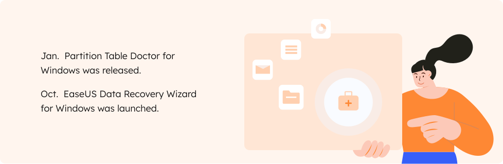 Soluções de recuperação de dados EaseUS >>Durante o ano de 2005, expandimos a compatibilidade do Partition Table Doctor para incluir sistemas Windows e, simultaneamente, lançamos um software abrangente de recuperação de dados - EaseUS Data Recovery Wizard, transcendendo as limitações em cenários de recuperação de partições.