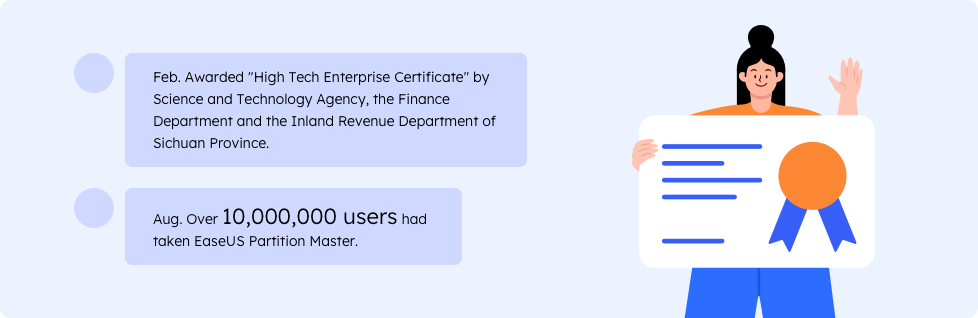 Soluções de backup de dados EaseUS >>Em 2010, conquistamos ainda mais reconhecimento do setor, com a base de usuários do nosso software de partição ultrapassando 10.000.000, e um número crescente de pessoas se familiarizou com nosso software e marca.