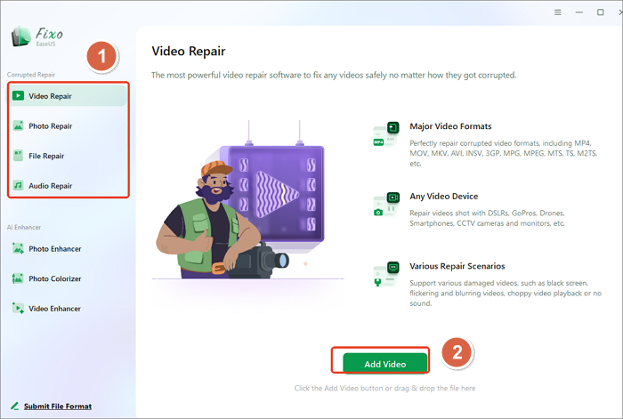 Passo 1. Abra o EaseUS Fixo e escolha o tipo de arquivo que deseja reparar no painel esquerdo. Em seguida, toque em "Adicionar Arquivo" para enviar vídeos, fotos, documentos e áudios corrompidos.