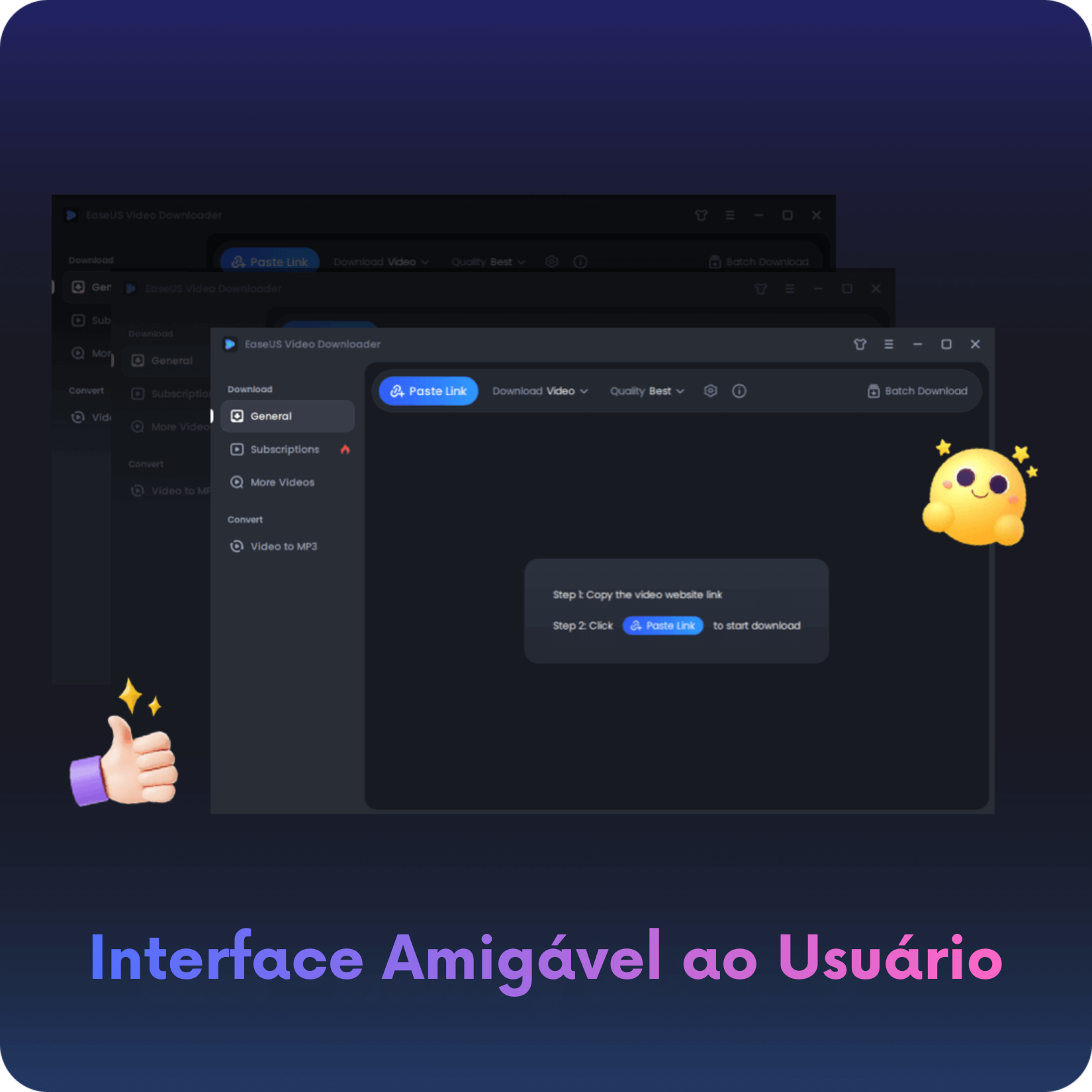 • "O EaseUS é um software de download de vídeos para Windows que ajuda você a baixar vídeos em HD, QHD 2K, UHD 4K e 8K do YouTube, Facebook, Dailymotion, Vimeo e milhares de outros sites de compartilhamento de vídeo."