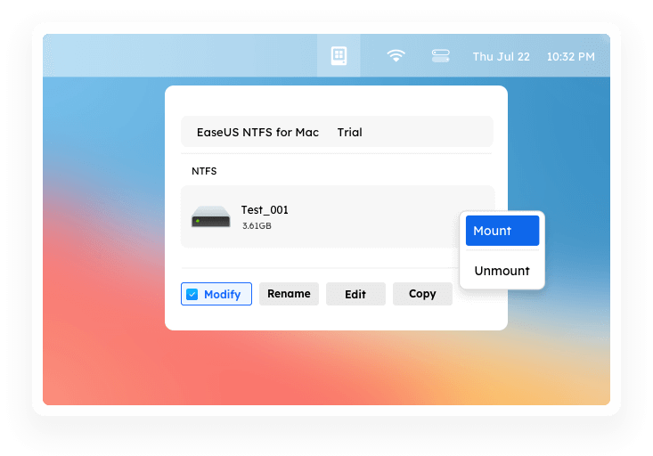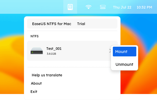 O disco rígido externo não monta no Mac? Agora, com o montador EaseUS NTFS for Mac, você está livre para montar e desmontar discos rígidos NTFS - você não precisa mais mexer com comandos de terminal para montar partições manualmente, e é apenas um clique de distância para fazê-lo! Ele ajuda a colocar seu disco NTFS na barra de status do Mac, para que você possa obter acesso rápido para visualizar, copiar e gravar arquivos para volumes NTFS na barra de status.